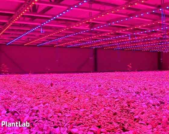 A Netherlands-based company called PlantLab has devised a method for growing plants indoors using an unearthly pink-purple light made by a combination of red and blue LED lights, instead of sunlight.