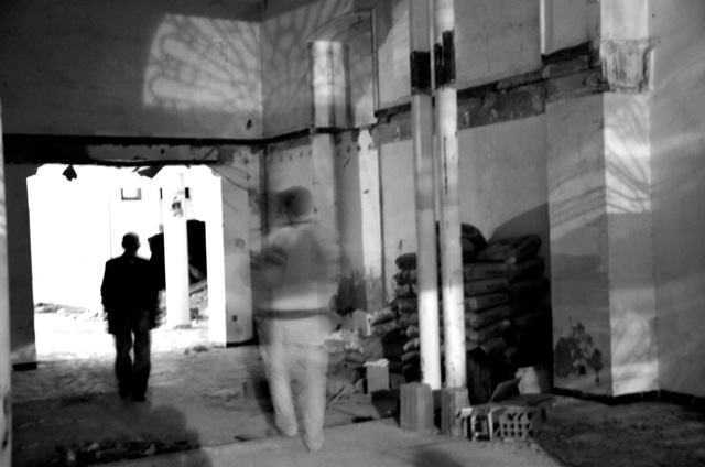 Two men in a cavernous building filled with sand and construction materials. The Jasmine revolution was sparked as a result of joblessness and corruption. Are renovation projects like this a sign that the country is moving forward?