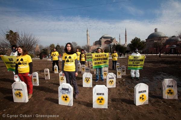 As part of a wider Greenpeace campaign, protestors gathered outside the Hagia Sofia Museum in Istanbul to highlight the dangers of nuclear. The protest marks the lead up to the first anniversary of the Fukushima disaster in Japan which will take on March 11. According to campaigners, the day of action is also to remind us of the fact that the world’s more than 400 nuclear reactors pose an ongoing threat to the hundreds of millions of people who live in their shadow.