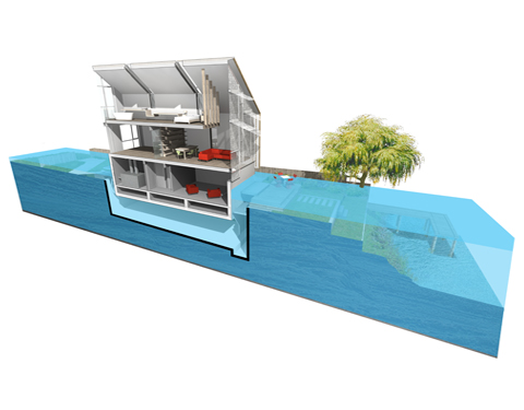 An amphibious building follows the basic concept of a fixed dock. It’s tied to the ground via static structural foundations with sliding components. When tide movements or flooding occurs, the entire structure rises up along its fixed underpinning and floats in stable position, buoyed by the floodwater. It resumes normal setting when the waters recede.