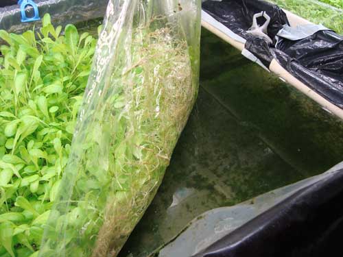 The membrane looks like a plastic sheet allows for no-soil and low-soil farming, with the water and fertilizer separate from the plants roots. The roots remain dry while drawing water and nutrients from below the membrane, and oxygen from the air. Lettuce and other leaf vegetables can be grown with no soil.