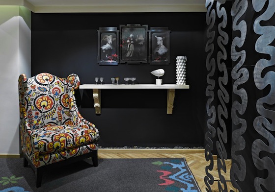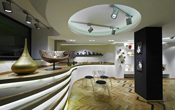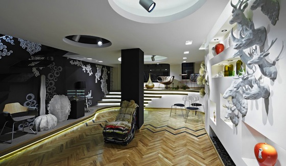 The oak herringbone flooring is typical of residential Turkish architecture, but less usual is applying the store’s branded graphics to the wallpaper and screens – a kind of subliminal messaging system that compliments the rag chair, faux animal mounts, swirling gold lighting and other unique design and furniture objects.