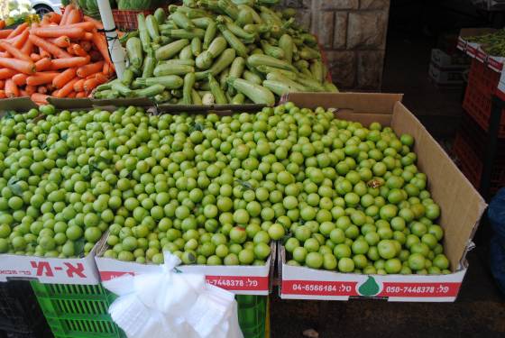 Sour green plums the size of large marbles are in the shuk now, a seasonal favorite of the Iraqi community. Eat them out of hand as a snack, sprinkling each bite with a little salt. The classic Iraqi way to cook them is to pair them with meat in a flavorful stew. And if you want to ask for them in Persian, say, “Gojeh sabz!”