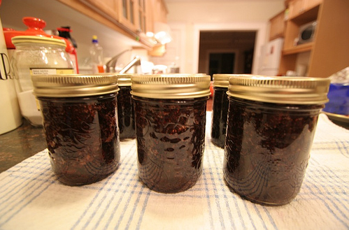 5. Can your jam. Using a ladle, and a wide-mouth funnel if you have one, carefully fill the sterilized jars with your jam. You need the jars to be quite full: fill them to within 1/4″ to 1/2″ of the very top (technical term for this: headspace). Using a dampened paper towel, wipe the rims of all the jars, to ensure that they are clean and not sticky. (Any jam on the rim will prevent the formation of a tight vacuum seal.) Place the lids on the jars, and then lightly tighten the bands around them – stop turning as soon as you feel resistance. (The bands are there to keep the lids in place, and are not actually involved in sealing the jars. If you tighten the bands too much, they will prevent air from escaping the jar, which is the process you want to encourage.)