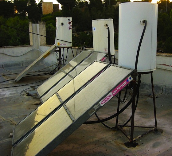 Image of solar powered water heaters in Jerusalem via Gilabrand, Wikimedia Commons