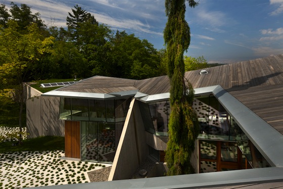 The reclaimed beams were put to work as triangular frames, according to the designer’s website. “These were folded to create a roof which would act as a secondary artificial landscape, which we draped over the gentle slope of the site. We manipulated the creases to create implicit and explicit relationships between indoor and outdoor space, such that every interior room had a corresponding exterior room.”