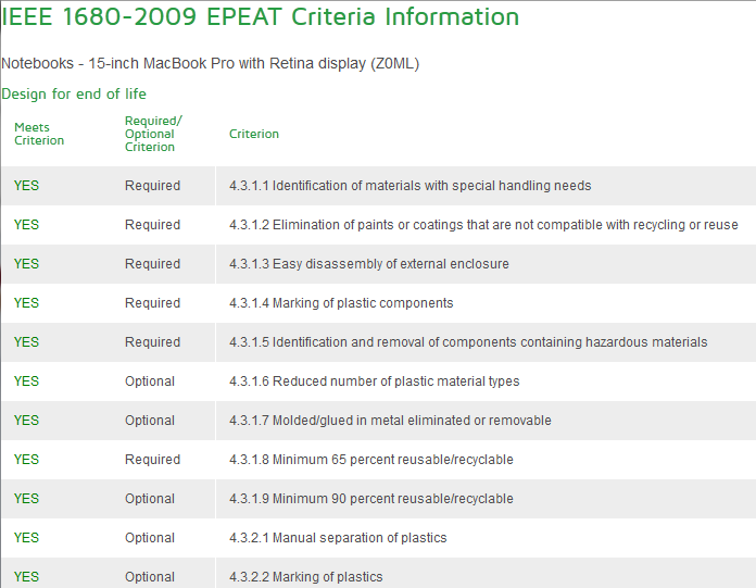 Now that Apple has reversed its decision, anyone can search the EPEAT website and see some of the criteria which helped the 15 inch MacBook Pro earn a ‘Gold’ rating: