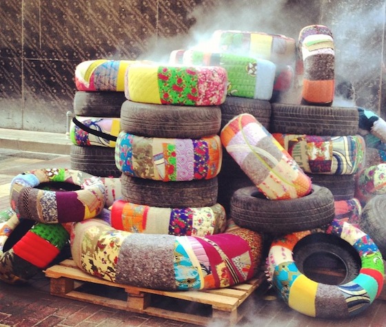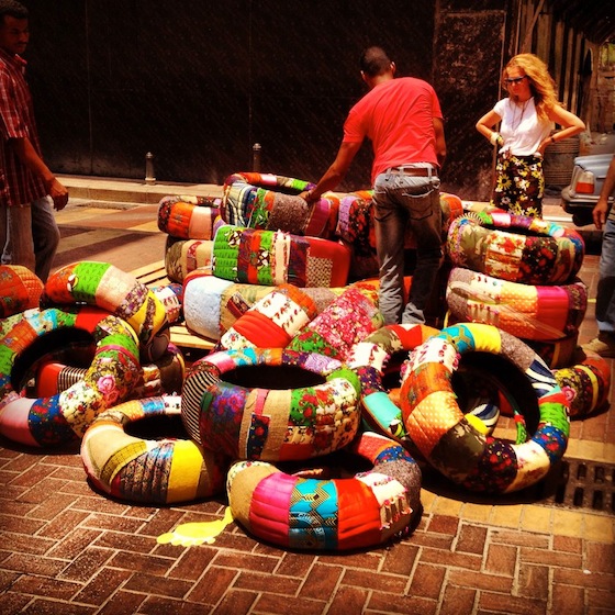 Following a spate of tire burning protests in Beirut that choke the city’s skies and people, Hoda Baroudi and Maria Hibri staged a colorful protest. The creative duo behind Bokja Design Studio treated more than a dozen tires with the same reverence as their antique and vintage furniture pieces by wrapping them in opulent textiles reminiscent of the Levant and legendary Silk Road. They then scattered the adorned tires across a road in Saifi Village as two young volunteers held a banner stating quite simply: “We are Tyred.”