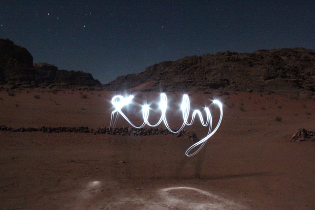 My tech-savvy friend, Lindsay Rassmann, suggested we do a little experimentation with light graffiti before retiring for the night in our tent at a camp in Wadi Rum last month. Her top-notch Canon Rebel T3I was placed on a tripod, and we found two sleek little flashlights to use.
