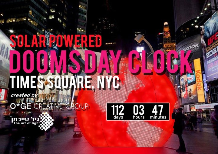 Designers from Israel hope to install a solar-powered doomsday clock in Times Square, where it will count down to 12-21-2012. Using cutting-edge technology, including concentrated photovoltaic power and LED lights, the glowing four meter globe is designed to harness humanity’s attention in the lead up to the so-called end of times.