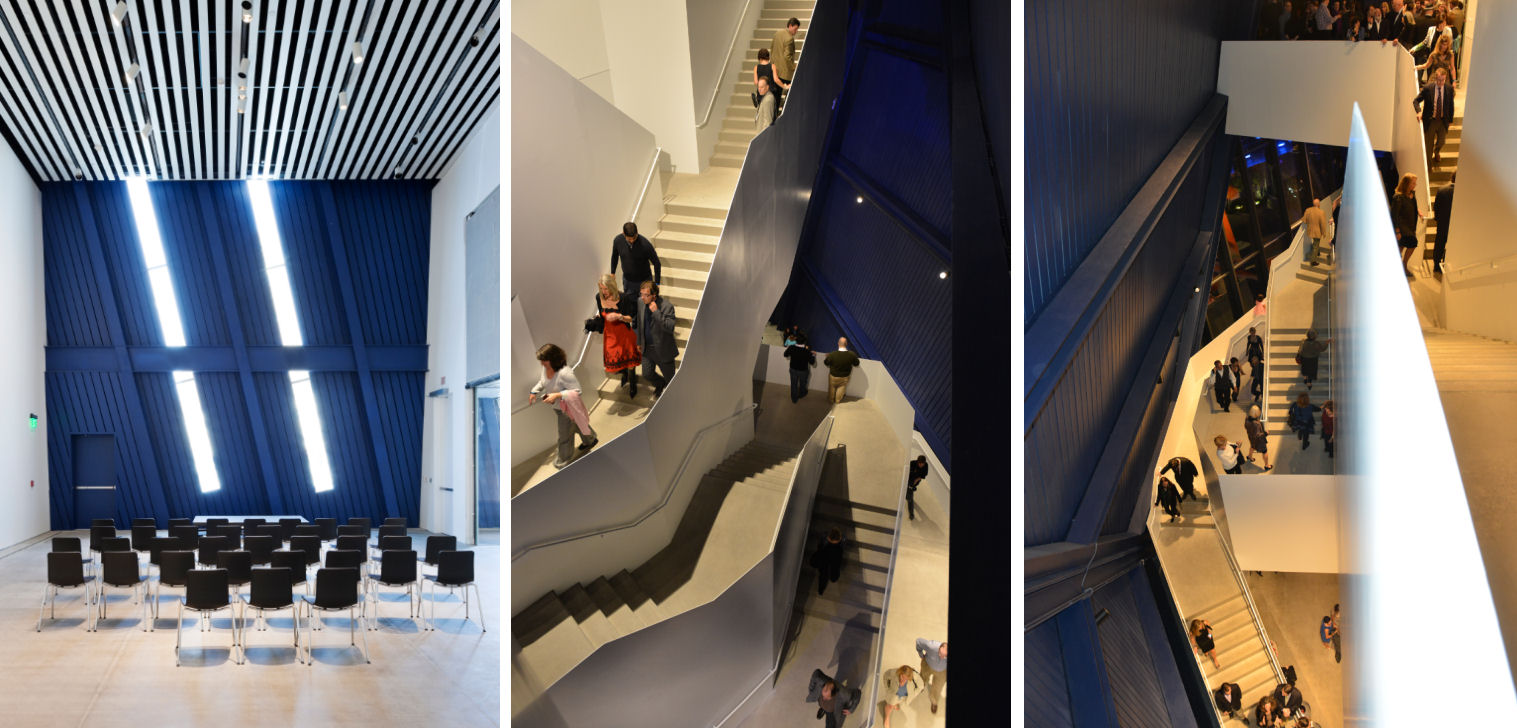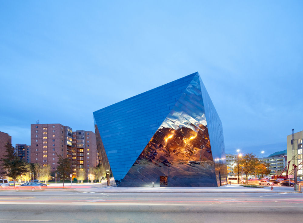 The three story museum opens with an enormous lobby area and a bold staircase that winds through the interior. A striking series of shiny triangular panels culminate in a four-sided crown, giving the museum its unique shape.
