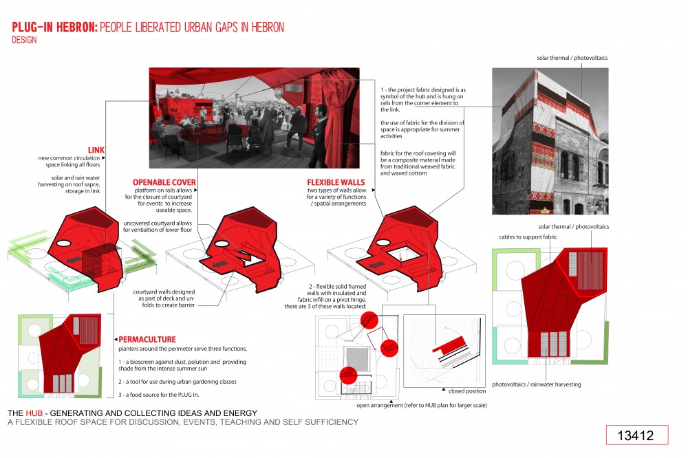 “This will be the first of a series of hubs,” according to the project’s design brief, “beginning at points of intense interaction between military intervention and civilian life in the Old City. From these points, the hubs will catalyse site specific change and incrementally over time reclaim space for the civilian.”