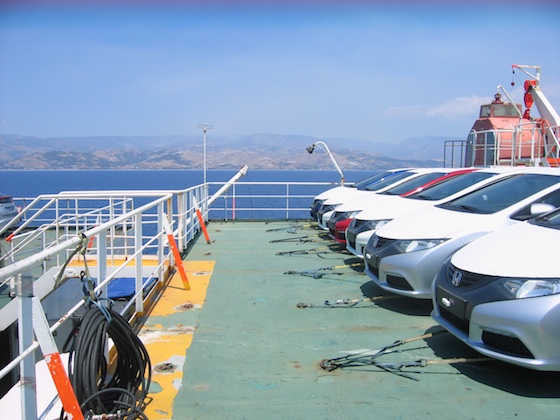 Two hours later and I’m on the top deck, the whole port spread out below. Cranes loading and unloading, dockers driving cars into the belly of the ship, and crew kissing their colleagues goodbye. The Grande Europe is basically an enormous windowless multistorey car park: 1,900 shiny new cars parked bumper to bumper, from the factories of Northern Europe and bound for showrooms in Israel and Cyprus.