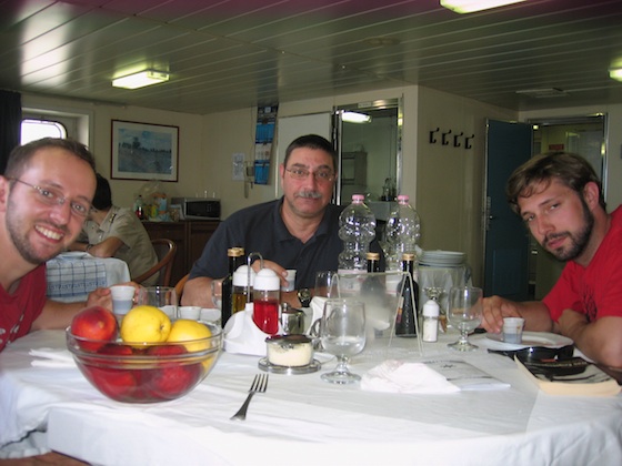 I’ve now met all of our fellow passengers. There’s George, a jovial lecturer in archaeology, and his student Michael, both from Germany. They’re shipping excavation equipment to a dig in Jordan. There’s Jenny and Frank, a somewhat starchy English couple who have lived in New Zealand since the ‘60s. Franks spent much of his life working at sea as a skipper on dredgers. There’s Phil from Plymouth, who is realising the ambition of a lifetime on this voyage.