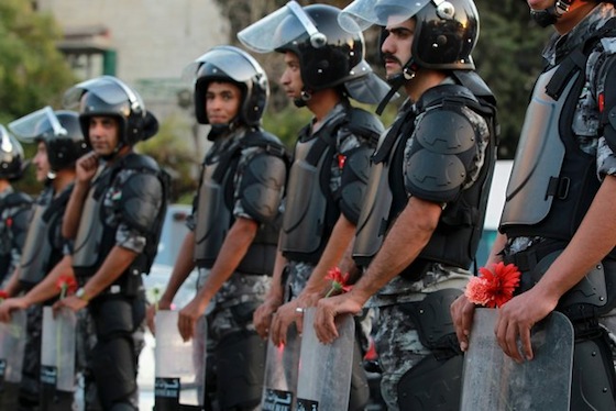 Image of Jordanian forced holding flowers distributed by protesters calling for release of political prisoners in Amman last month. Muhammad Hamed/Reuters.