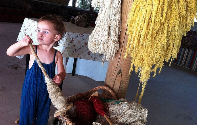My daughter playing with the hand-woven spools of wool.