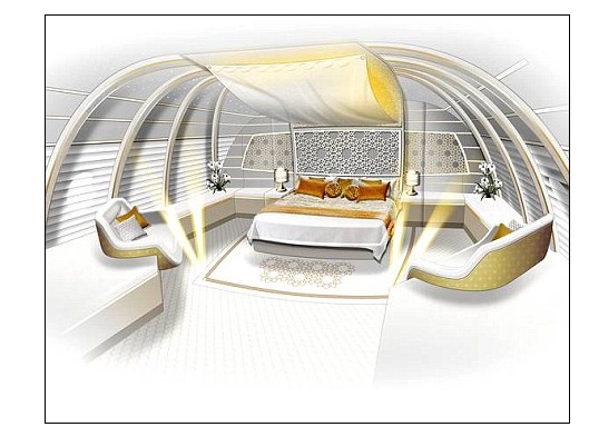 The floor and walls of a “well-being room” act as giant movie screen, displaying views of earth’s surface as the plane flies over. Here passengers can stand on a “magic carpet” and watch their journey progress, scented breezes blowing into the room. There’s a state-of-the-art concert hall too.