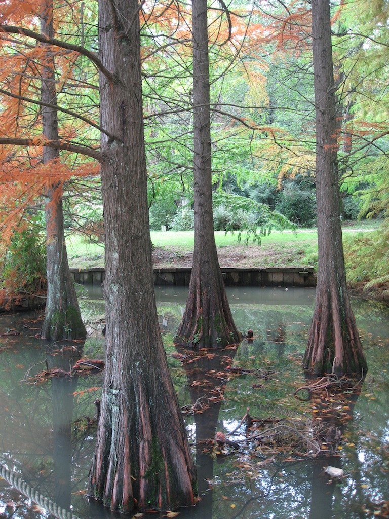 The trail passes through groves of Giant Sequoias (Sequoiadendron giganteum), Redwoods (Sequoia sempervirens), Ginkgos (Ginkgo biloba), Western Red Cedars (Thuja plicata), Chinese Parasol Trees (Firmana simlex), Hungarian Oaks (Quercus frainetto), Silver Maples (Acer saccharinum), the endangered Dawn Redwood (Metasequoia glyptostroboides), and, perhaps most unusually, swamp-dwelling Bald Cypresses (Taxodium distichum).