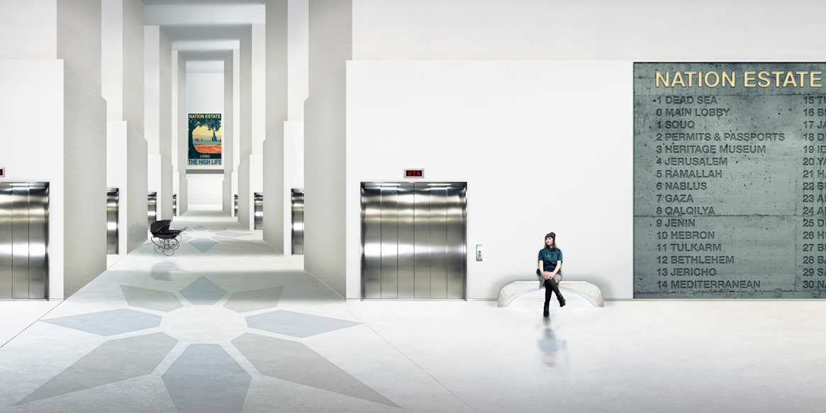 Palestinians can live “the high life” in Nation Estate – a nation within an enormous high rise building. Each floor represents a particular city:- Bethlehem is on the 12th floor and Jerusalem is on the 4th.