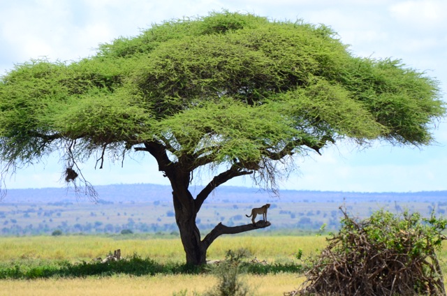 Amboseli National Park in Kenya is a magical place. Here a cheetah stands on a branch eyeing a nearby wildebeest herd. She is hunting and the babies are easy prey.