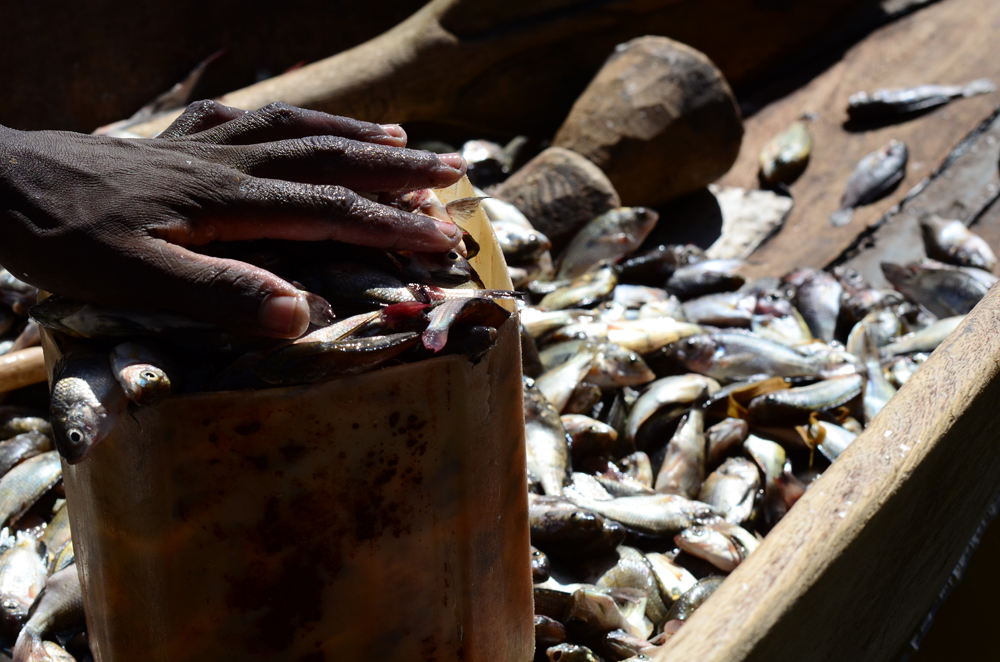 Two men were fishing for these tiny sardine-like fish in Lake Jibe, Tsavo National Park, Kenya. We paid about one dollar for a whole bucket of them. Unlike some parts of Kenya that have been over exploited, this lake is relatively unknown.