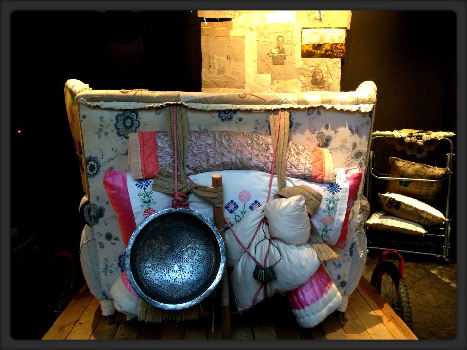 With a pile of rolled up rugs and bedding attached to its back, the way cyclists pack their bikes, or nomads pack their camel saddles, and a drawer that mimics a suitcase at its base, the couch appears to be ready for travel. Add some flaps to the side – like wings or a rudder – and the thing seems poised to take flight.