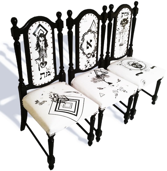 One of their recent designs, a series of chairs, drew inspiration from the Jewish legend of Golem. The chairs featured Hebrew calligraphy, images of the body, nature and death, contrasted with simple angular patterns and youthful faces.