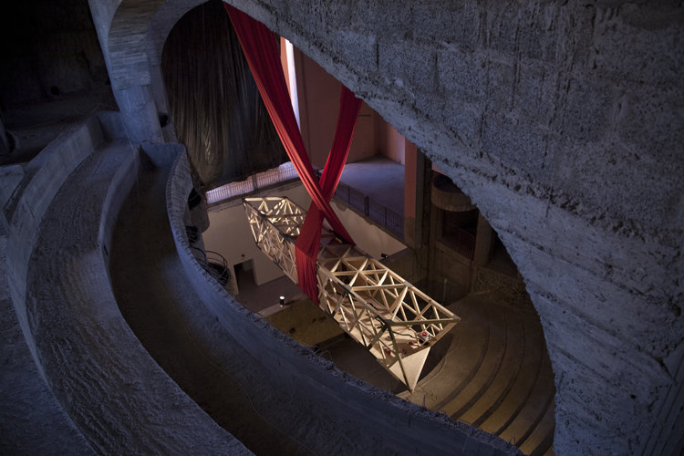 A site-specific design that appears to be suspended between the stage and opera pit of the Theatre Royale, which was built in the 1970s as a near copy of the Garnier Opera House in Paris, The Rise and Fall consists of a latticed wooden structure balanced on a hidden steel frame.