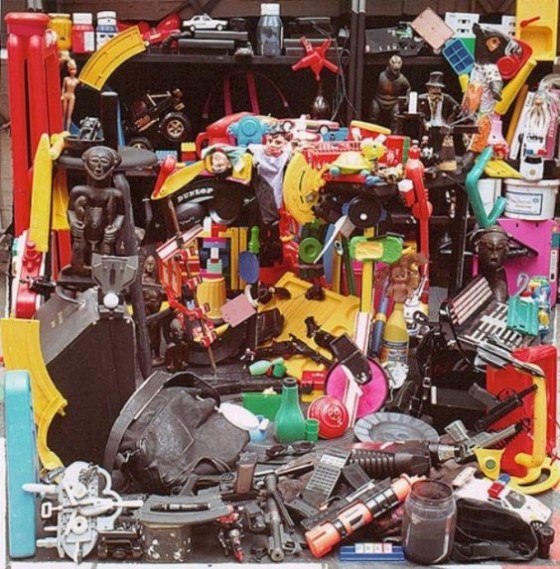 Relying on old trash gathered near his installation sites, Bernard Pras from France assembles clothes and rags, wood, old record albums, dishes, broken toys (and anything else he can grab) to re-interpret pop-culture images. It’s far from ad hoc: his material selections include specific choices that add a subtle undercurrent to the imagery.