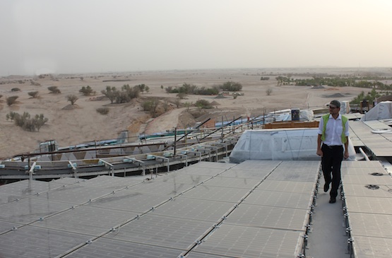 Dieter Moor walking “on” the roof of the Sheik Zayed Learning Center, inspecting the progress of the installation.