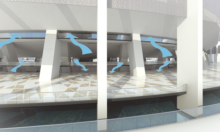 Additionally, using the Venturi effect, the designers propose to hasten air pressure across the colonnades to further promote cooling. These also provide thermal massing.