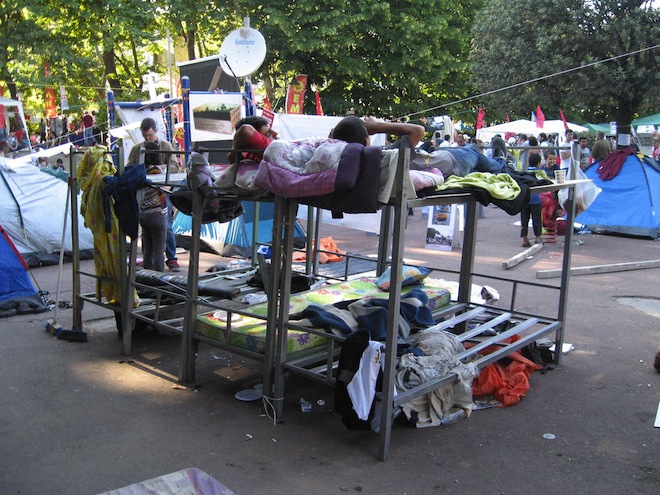 When it did, all kinds of unique structures popped up, including bunk beds for sleeping, makeshift barricades constructed out of benches, and all manner of tents made from fabric cutouts, steel, wood, and other scrap or found materials.