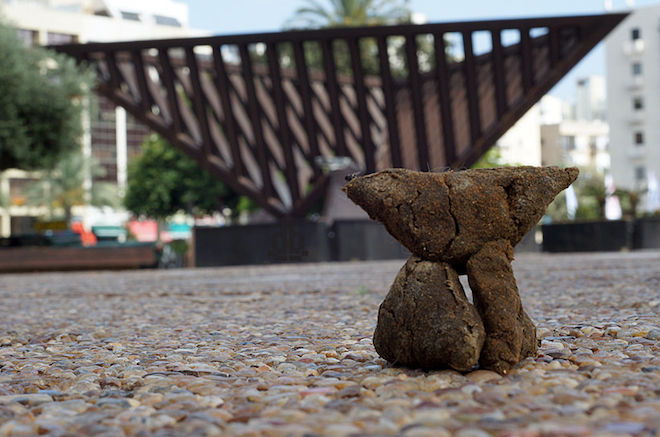 He arranged his poop shapes to resemble various landmarks across Tel Aviv, including the soaring Azrieli Center, the large sculpture outside of City Hall, as well as the leaning steel ellipses that are on display in Habima Square.