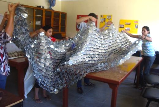 Three local women learned to make the lamps with recycled materials such as paint and soda can lids. These were strung together in long shades that wrap around a powerful bulb, which in turn receive their energy from solar panels donated by the LOCUS Foundation.
