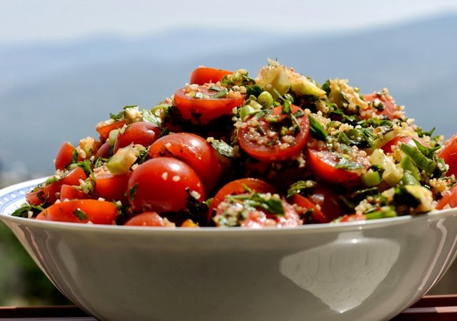 The recipe below reflects the home gardens and use of available products that come so naturally to the Druze. It’s a herby twist on tabuleh that features brilliant red cherry tomatoes. Enjoy!