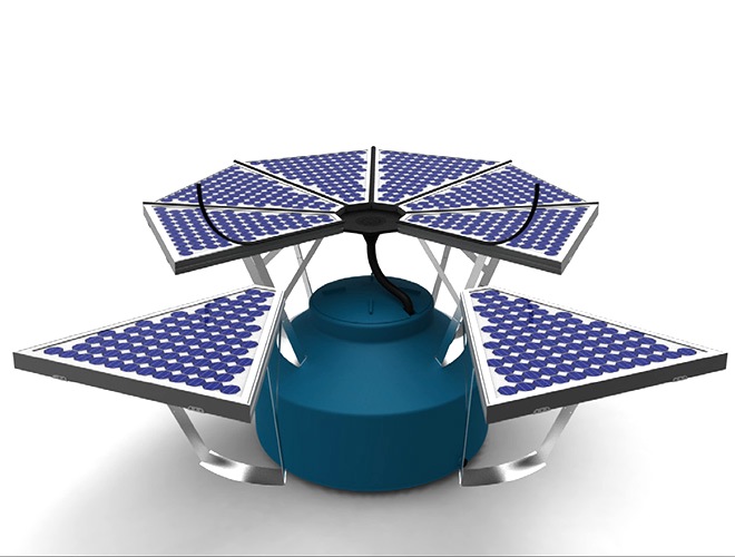 Covered with a special antireflective film that promotes maximum thermal absorption and reduces the amount of dust collected, the panels also funnel water into the unit’s holding base.
