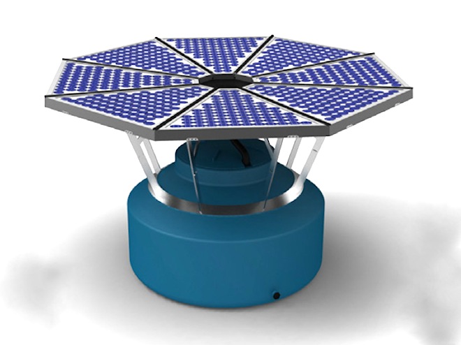 Eight triangular photovoltaic panels are arranged at a three degree angle in the shape of an octagon.