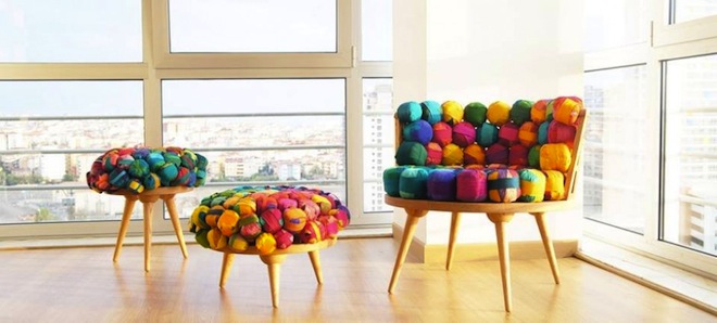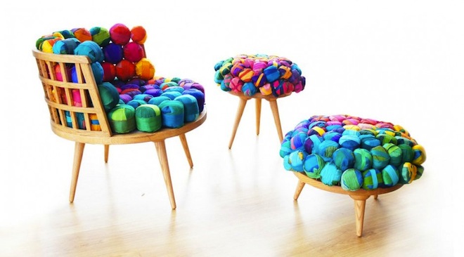 The Istanbul-based designer uses American oak and recycled silk yarn from Nepal to weave together these kaleidoscopic, fluffy silk furniture pieces.