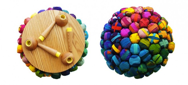 A nice way to reuse small swaths of material. Looks comfy and fun, and this could inspire ways to create poofs for kids’ rooms.