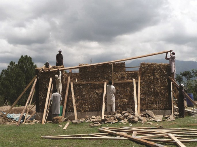 Pakistani straw bale homeIn Pakistan, reinforced straw bale homes are built out of regionally appropriate materials using few tools.