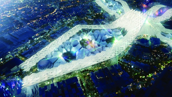 A carefully designed human circulation system is designed to foster new connections, and a fully automated underground tube system will connect the pavilions in a way that keeps services “invisible.”