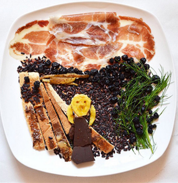 She took inspiration from some old masters such as Hokusai’s The Great Wave (realized in boiled rice) and Edvard Munch’s The Scream (played out in sliced peppers).
