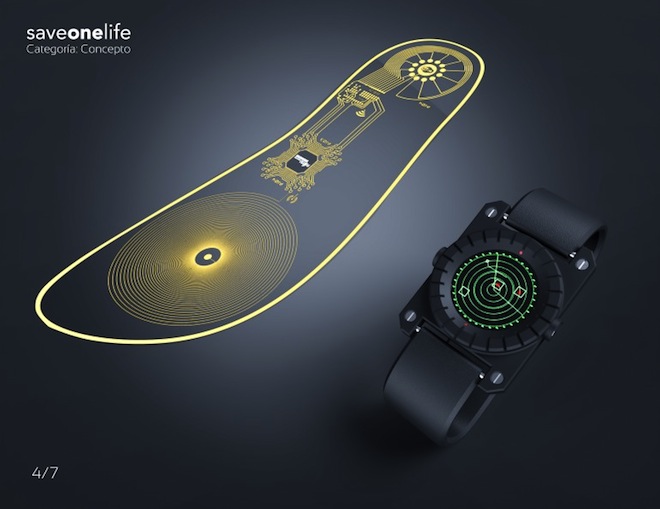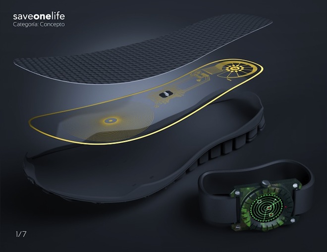 SaveOneLife boot soles are equipped with tiny microprocessors that pick up electromagnetic signals – like a mini metal detector. Embedded radio transmitters then send a message to a wristband interface when the wearer steps within a 6.5 foot radius of a land mine, alerting them to the impending danger.
