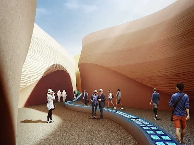 Foster + Partners, Milan Expo 2015, terracotta walls, UAE pavilion, green design, clean tech, solar power, CO2 absorbing materials, LEED-PlatinumRemember how exciting it was when we first saw pictures of Masdar City in the United Arab Emirates. Masdar is the futuristic terra-cotta curvy buildings designed by Foster & Partners? Well, the same design team is behind the United Arab Emirate’s solar-powered 2015 Milan Expo Pavilion and it features a host of groundbreaking technology.