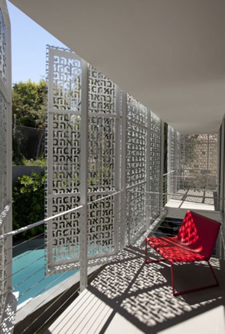 Bob Hale, of Rios Clementi Hale Studios, wrapped his house in LA’s Cheviot Hills neighborhood in a perforated-metal screen like the Arabian screens the mashrabiya, which provide shade and privacy. But Hale’s home is punched with “ahava” – the Hebrew word for love.