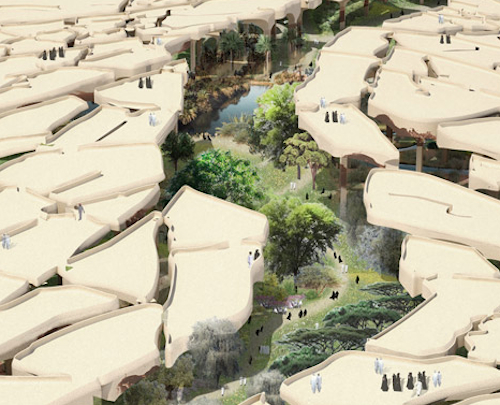 In response, the studio came up with the idea of creating a continuous domed canopy lifted about 65 feet off the ground. From above they look like cracks in the earth created by the desert sun, but below, they shelter a rich, cool and well-ventilated urban oasis.