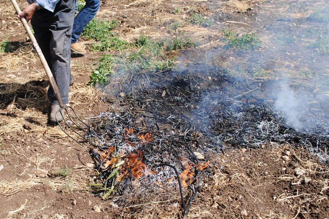 Salman Nijim Abu Heissam dragged a pitchfork full of dry thorns to a bare patch of earth, away from danger to the growing crops.