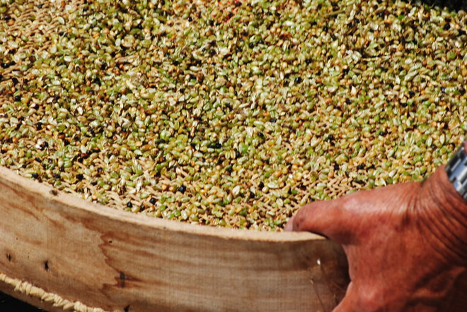 The freekeh kernels, freed from their stalks, fell through the sieve’s holes. We collected them and turned the sieve over to receive them from the deep side.