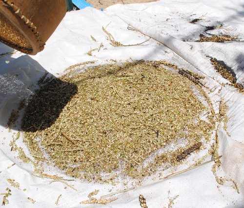 I was surprised again, thinking that it would be the other way around, but understood when I saw how the straw and chaff separate from the kernels as they’re rubbed on the surface of the sieves.