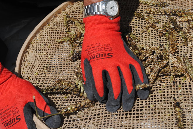 The farmer wore heavy gloves to work the stalks back and forth over the old hand-made sieves.